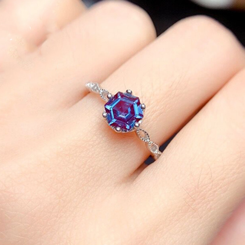 Alexandrite Sterling Silver Ring featuring a 6mm hexagon-cut gemstone in a prong setting. Elegant 925 silver band ideal for engagement occasions.